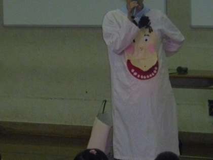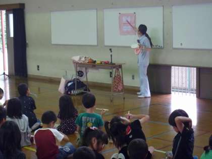 2時間目に指導員さんと「てつやくん」による歯みがき指導を行いました。歯ブラシの正しい使い方をていねいに教えていただきました。去年も実施しましたが,初めてのことのように!?熱心にお話を聞いていました。