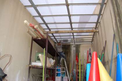 運動場の体育倉庫の屋根が古くなり,雨もりがしていました。