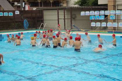 今日から水泳学習を始めました。初めの3日間は,水慣れです。最初はみんな「やったぁ,入れる!」と嬉しそうでしたが,入ってみると「ギャー!冷たい!」と悲鳴が…。曇り空の中,少し震えながらの子どもたちでした。