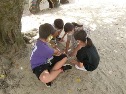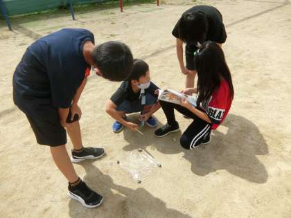 今日は運動場で,水はどのように流れるかの実験をしました。
