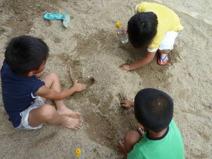 今日もとっても暑かったので,みんなで砂場で水を使って遊びました。「どろがふわふわできもちいいなぁ。」「水を流したら砂がかたまるよ!」みんなで夏の遊びを楽しみました。