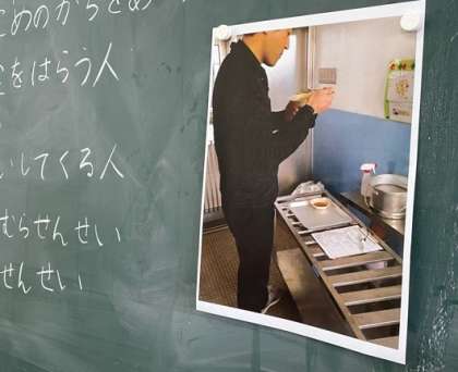 栄養教諭の大上先生に,給食ができるまでにどれだけの人が携わっているのかという話を聞きました。