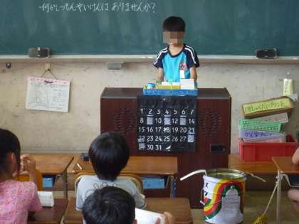 今日も夏休み自由作品発表会を行いました。今日は貯金箱が少なく,絵,ヤドカリハウス,水族館,車の模型と多彩でした。