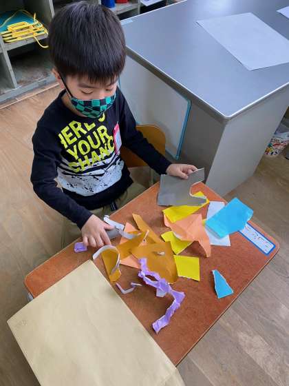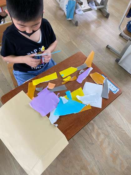 1ねんせい ずがこうさく「やぶいたかたちから うまれたよ」