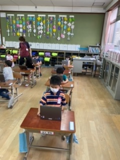 今日から,少しずつGIGA端末の使い方を学習し始めました。一人一台のタブレットの操作方法を学んでいます。起動とシャットダウンのやりかたを練習したり,数字を打つ練習をしたりしました。