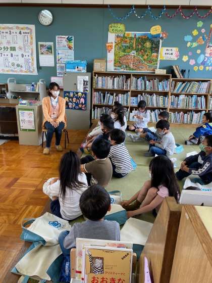 毎週木曜日に,図書館へ行っています。新しい本を借りたり,図書館の先生の杉原先生に読み聞かせをしてもらったりしています。子どもたちは,杉原先生の読み聞かせをとても楽しみにしています。