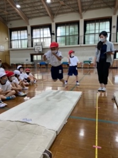 今日は,新体力テストの立ち幅跳びを測定しました。足の力だけでなく,腕の力も使って跳びました。子どもたちは,自分の力をしっかり出して,記録にチャレンジすることができました。