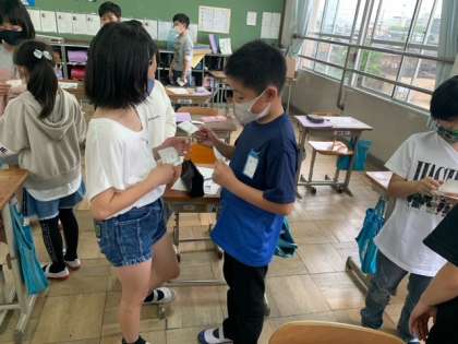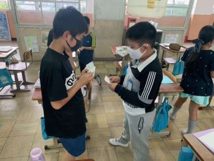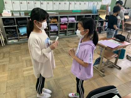 名刺を交換して友だちと自己紹介をし合いました。「Ilike blue.」「I like badminton.」など,自分の好きなものを伝え合うことができました。