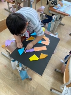 図画工作の学習では,「やぶいたかたちから うまれたよ」の作品作りを進めています。ただのやぶれた紙だったものが,向きを変え,組合せを変えてみると……いろいろなものに見えてきました。