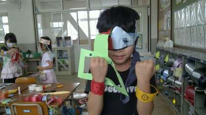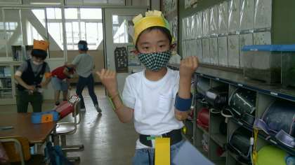 頭,腰,手首など,体のいろいろな部分に「わっか」をつけ,そこにいろいろな飾りをつけて,虫や王様などになりきりました。気分は最高!かっこいいぞ!