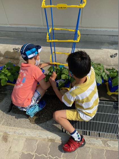 「大きくなってほしいな」と,あさがおに話しかけながら,水をやる姿も見られます。これからのあさがおの生長が楽しみです。