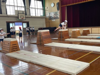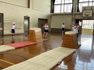 体育科ではとび箱運動の学習を行っています。跳べる技で高さに挑戦したり,自分の力に合った新しい技に挑戦したりしながら,楽しんで取り組んでいます。