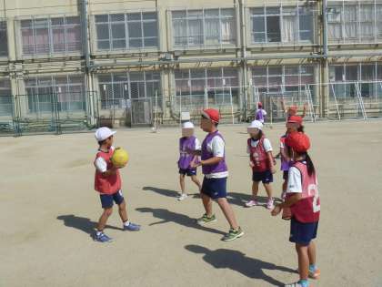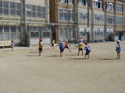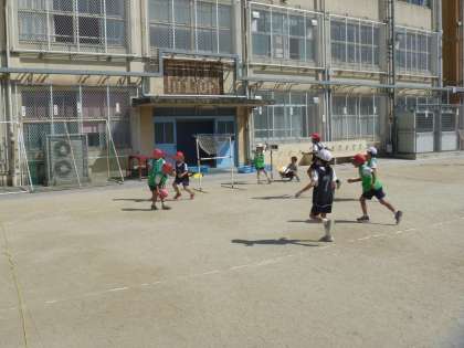 まだまだ日差しが強い中,パスゲームを頑張っています。細かいことでプレーを止めてしまうよりも,すぐに次を始めようということでだいぶんスムーズに流れるようになりました。ジグザグパス,待ち伏せ戦法,ひっつき虫作戦など少しずつ攻め方や守り方を考えています。「今日は勝てた〜。」「1点とったよ。」という声はうれしいですね。
