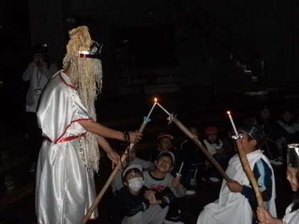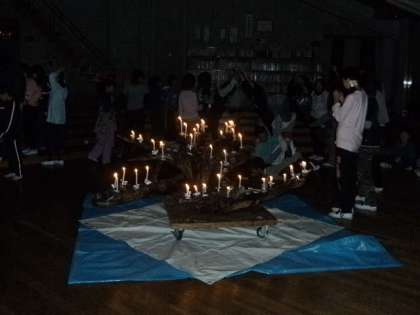 夕方から雨は上がりましたが、野外ではキャンプファイヤーができないので、館内のホールでキャンドルファイヤーを行いました。火の神様の登場によりはじまりました。