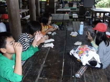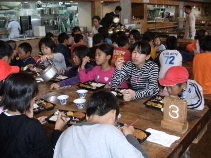 昼食は外で魚と一緒にお弁当をいただく予定でしたが、食堂でいただきました。午後からは館内でゲームなどをして過ごす予定です。