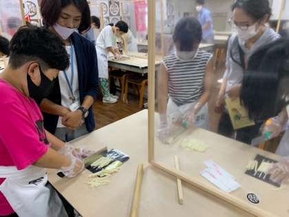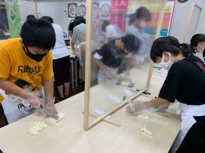 生地を切りました。子どもたちは、包丁で慎重に切っていました。