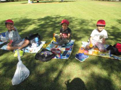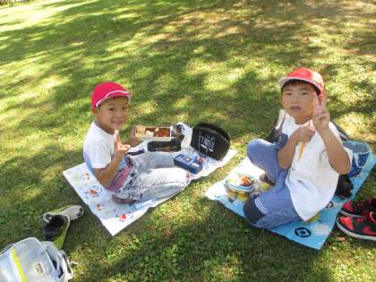 たくさん歩き,たくさん秋の宝物を見つけた後は,お楽しみのお弁当タイムでした。公園についた時から,「早くお弁当が食べたい」と口にしていたので,「やったぁ!」と大喜びで敷物を広げていました。
