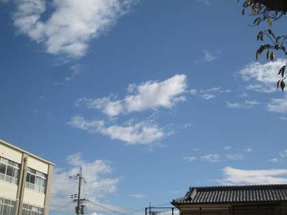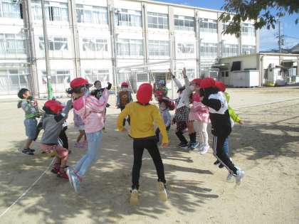 国語科で,くじらぐもの学習をがんばってきました。実際に外に出てみると,この日は2頭のくじらが学校の上にいました。子どもたちは声を合わせて,「天までとどけ,一,二,三。」と空に向かって大きくジャンプをしていました。