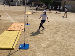 高跳びでは,跳び方は慣れてきましたが,高く跳ぶにはどうしたらよいか,話し合って挑戦しています。