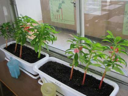 教室のホウセンカもつぼみから花が咲き,実ができてきました。