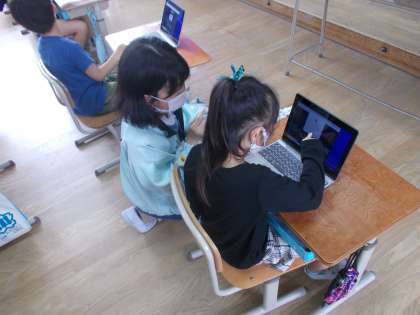 1年生にとては,初めてのGIGA端末でした。6年生が約束など入力の仕方など伝えました。