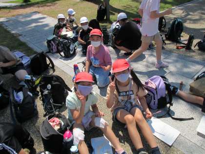おかざき周辺を散策した後は,学習プリントに気付いたことをメモしました。人が多い!修学旅行生がいる!バスが多い!など話していました。