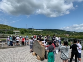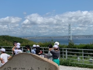 淡路サービスエリアでトイレ休憩と集合写真撮影をしました。とても良い天気で、明石海峡大橋と海の景色がとてもきれいでした。