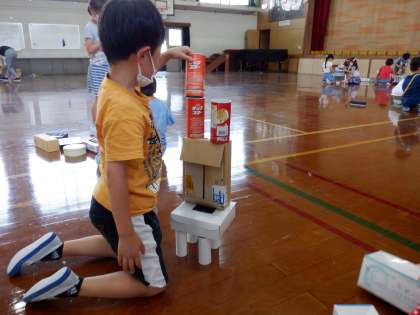 たくさんの箱や,洗濯ばさみや,カップなどを使って