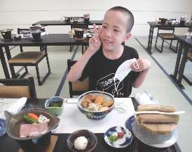 旅館では,夕食や朝食にたくさんのごちそうが出ました。