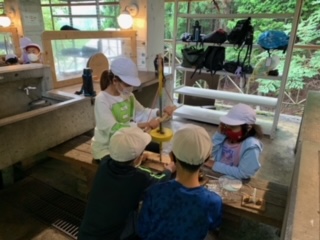 野外炊事に向けて、火おこしをしました。あいにくの曇空で火がおきるが不安でしたが、全グループ協力して火を起こすことができました。