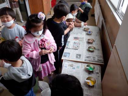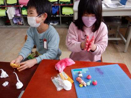 図画工作科『かざって なに いれよう』では、おうちで集めていただいた空き箱を、思い思いの材料を使って、きれいに飾りました。『ごちそうパーティー』では、紙粘土のごちそうをたくさん作りました。絵具を混ぜるのも,形をつくるのも、イメージ通りになるよう一生懸命考えていました。おいしそうなごちそうがたくさんできました!