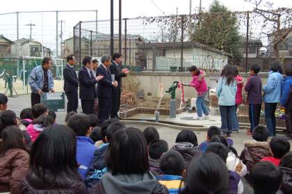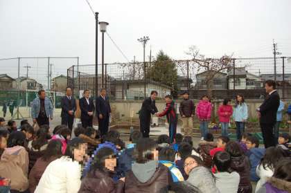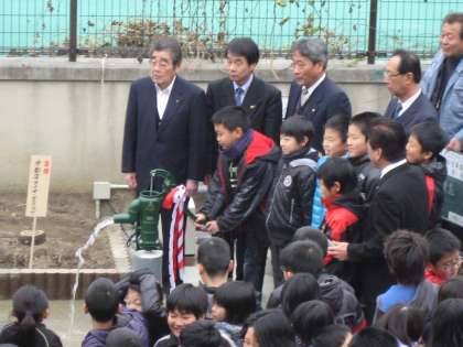 本部役員の人たちが,代表で井戸のポンプを押しました。