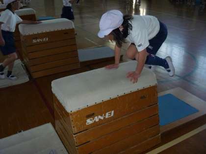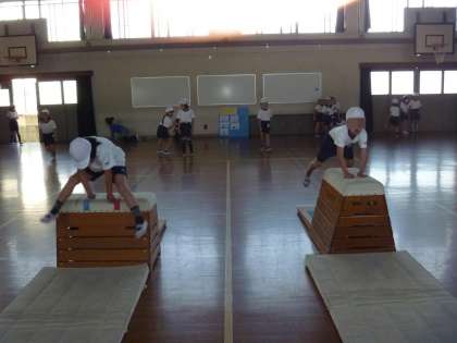 去年は,またぎ越えたり跳び越えたりという技が多かったですが,今年は「横開脚跳び」「たて開脚跳び」といった本格的な技にチャレンジする子どもが増えてきました。段数も6段まであります。「先生,5段が跳べるようになった〜。」と一つずつ段数が増えて喜ぶ子どもがいました。上から跳び上がり,たて開脚5段・横開脚4段,横開脚6段の場の様子です。