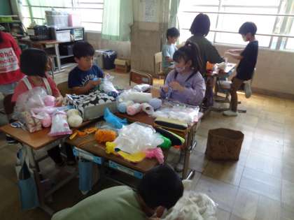 タオルや毛糸、綿やお花紙などを透明のナイロン袋に詰めていきます。できた袋と袋を両面テープや紐でくっつけたりつないだりしていきました。出来上がった作品に友だち同士で見せ合いながら「かわいい!」「じょうず!」と認め合う姿がとても素敵でした。