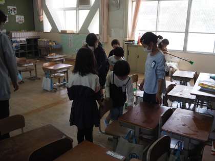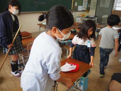 6年生のお兄さん、お姉さんに教えてもらいながら掃除を頑張っています。おそうじ名人になれるように、毎日頑張りましょう!