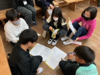 各グループで1日目の振り返りをしました。多くのグループが、5分前行動の反省をあげていました。