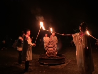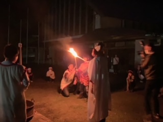 子どもたちが楽しみにしていたキャンプファイヤーです。火の女神から、友情、勇気、責任の火をもらい、灯しました。
