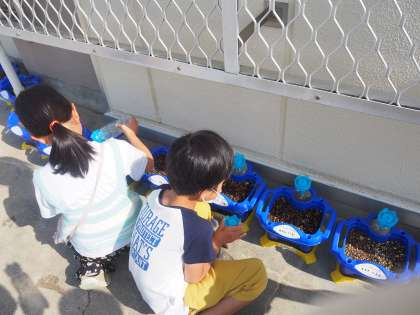 毎日、朝顔の水やりを頑張っています。今日は多くの子たちが「芽が出てきた!」と喜んでいました。