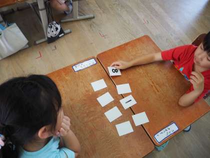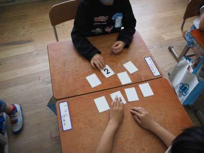 算数科の学習で、9はいくつといくつに分けられるか調べました。カードを使って、9になるようにペアで楽しみながら学習しました。