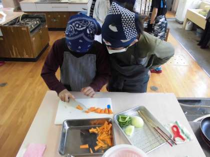 慎重に、慎重に・・・・。見守りながら野菜を切っています。