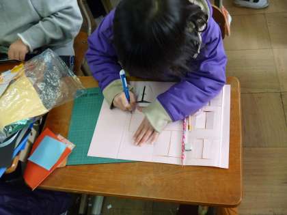 図工では,初めて一人一人がカッターナイフを持って制作に取り組んでいます。けがをしないように慎重に一つ一つ住んでみたい家の窓を切っています。なかなか指先に力が入らず,少しずつです。