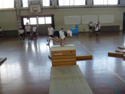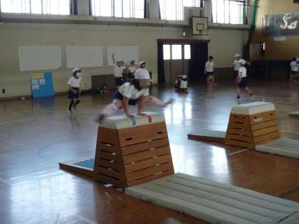 この子は最初から根気強く挑戦し,一段一段着実に高さを上げていきました。ついに恐がっていた横跳び越しもクリアーです。
