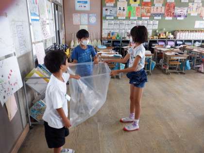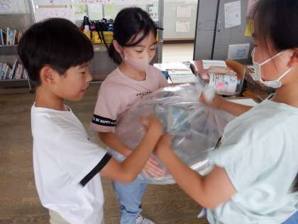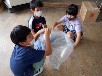 ビニール袋に空気をとじこめて、実験です。袋を振ったり、袋の口を開けて歩いたり、その場でくるくる回ったりして、うまく空気を集めていました。袋を押してみると、手ごたえが感じられました。