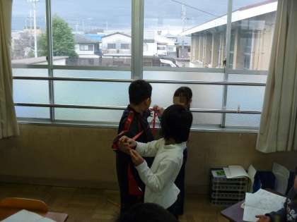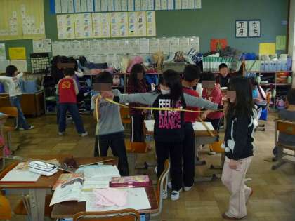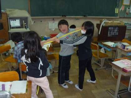 算数では両手を広げた長さを,100センチと30センチものさしを使って測りました。「124センチ」「108センチ」「143センチで一番や!」など楽しく協力して測ることができました。これからはm(メートル)を学習します。