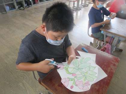 描いた花を切り、背景を貼付け素敵な花の作品ができました。子どもたちは、改めて校庭の花の良さに気づきました。