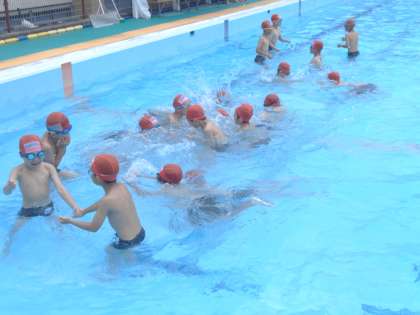今年度初めての水泳学習。子どもたちは、一週間以上前から楽しみにしていました。心配されたお天気も、朝からのプール日和にとてもうれしそうな様子。今日は、水慣れとバタ足を中心に取り組みました。