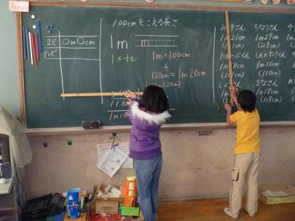 今日は100センチものさしと30センチものさしを使って,教室の中にある100センチ以上のものを測りました。黒板,窓枠,手すり,ロッカーなどみんなで協力して測りました。「黒板の横は100センチものさし3本以上あるよ。」「ドアの届かないところは上から測って…。」「先生の身長は?」など楽しかったです。