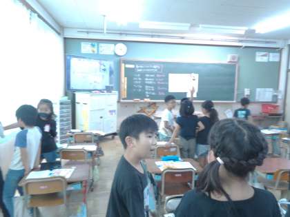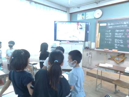 「動物のすみか」前回校庭をまわり、色々な生き物がどこにいるかを探しました。探したことをみんなで共有し学校地図にまとめました。その結果を見て「どうしてバッタは、草が多いとこに集まっているのかな?」「チョウチョが花壇の近くに多いのは、蜜を吸うから・・」「「ということは・・・」友達と一緒にたくさん意見を出し合って考えることができました。