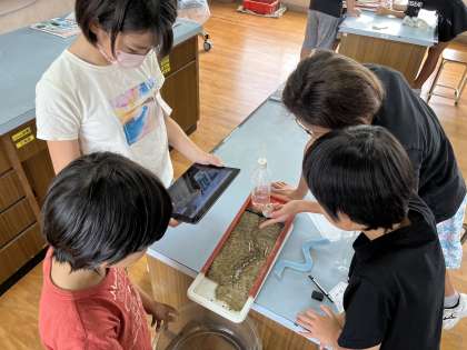 流れる水のはたらきを調べるために、流水装置を使って実験しました。運搬、侵食、堆積の3つのはたらきがあることに気が付きました。