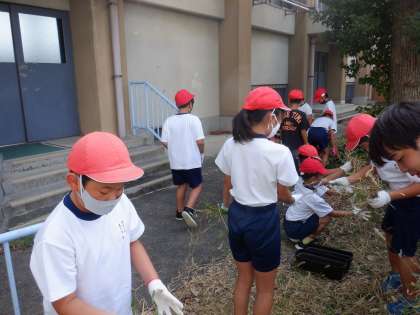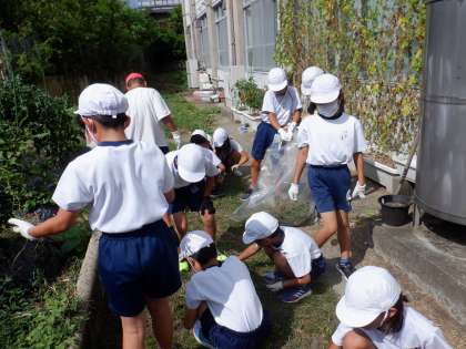 校内の草抜きをしました。今回は学年ごとに分かれて、4年生は畑の周りの草を抜いてきれいにしました。大きなごみ袋が満杯になって、すっきりしましたね。
